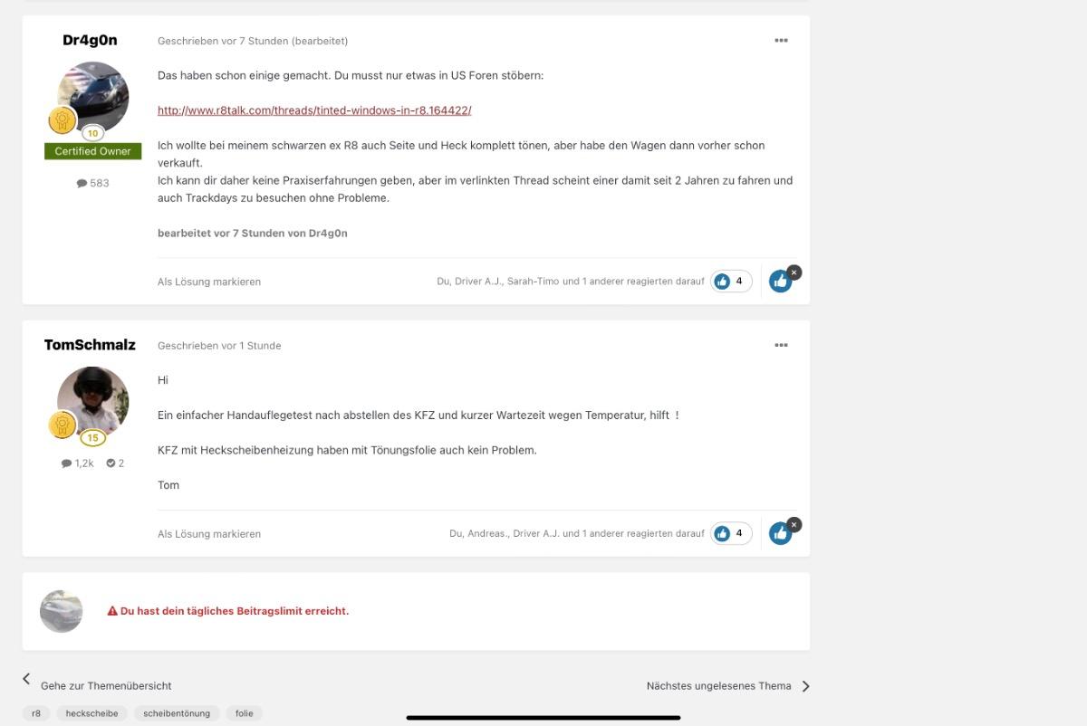 sagt mal…ist beim R8 eine Heckscheibenfolierung nachhaltig oder ergibt das aufgrund der Hitze im Motorraum absolut keinen Sinn?