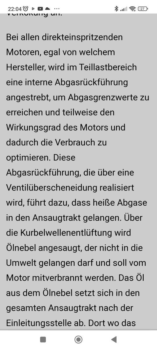 Um die tollen CO 2 Grenzwerte einzuhalten bedarf es heutzutage einiger Tricks. Am einfachsten lässt sich so ein Scheiss mit einem AGR Ventil(Abgasrückführung) erledigen. Verbrannte Abgase werden angesaugt und der frischen Ansaugluft zugeführt. Diese Luft ist aber jetzt nicht schön sauber sondern voller Ruß und anderem Rotz…….. und überall im Ansaugbereich eines Motors lagern sich jetzt Rückstände ab welche sich „früher“ niemals hätten Ablagetn können.