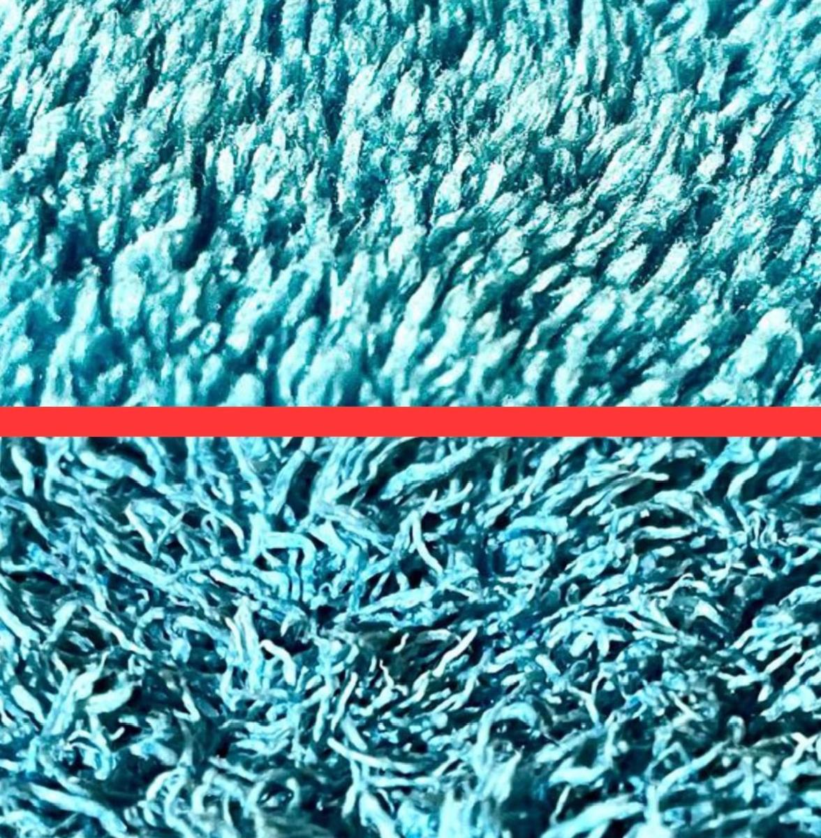 Da ich an der Stelle meines Test schwer abschätzen konnte, ab wann möglicherweise die Fasern der MFT beginnen würden zu verbrennen und harte, kleine Fremdpartikel zu bilden, musste ich etwas härtere Testmethoden anwenden. Erneut wurden beide MFT in Wasser getaucht bzw. nass gemacht. Beide gingen nun in die Trocknerrunde #3, allerdings dieses Mal in ein 180-minütiges Programm für -Handtücher-. Auch nach nunmehr insgesamt 5-Stunden im Trockner konnte ich keine Entstehung von Fremdpartikeln erkennen. Mit dem Handy habe ich versucht eine Nahaufnahme der Fasern festzuhalten, um einen möglichen Unterschied zwischen MFT1 (sauberes Tuch ohne Detailer) und MFT2 (eingetrockneter Detailer) feststellen zu können. Die verklebten, teils zusammengedrückten Fasern von MF2 (unten) sind nicht zu übersehen, die Fasern von MFT1 (oben) sind deutlich lockerer, wenn auch borstig und fest.