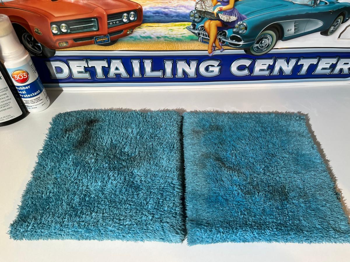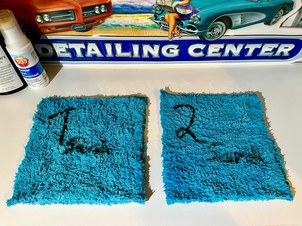 Zunächst habe ich am Samstag Nachmittag zwei meiner Mikrofasertücher für den Test ausgewählt. Beide gleich alt, beide vom selben Typ des selben Herstellers, gleiche GSM (500), beide 40 x 40 cm, beide 70% Polyester/30% Polyamid, beide wurden bisher gleich eingesetzt und in einem optimal sauberen Zustand für den Test herangezogen. Ein Mikrofasertuch (MFT1) blieb zunächst unbehandelt. Ein zweites Mikrofasertuch (MFT2) wurde mit einem Detailer kräftig benetzt. Beide Tücher wurden mit einem wasserfesten Stift beschriftet.