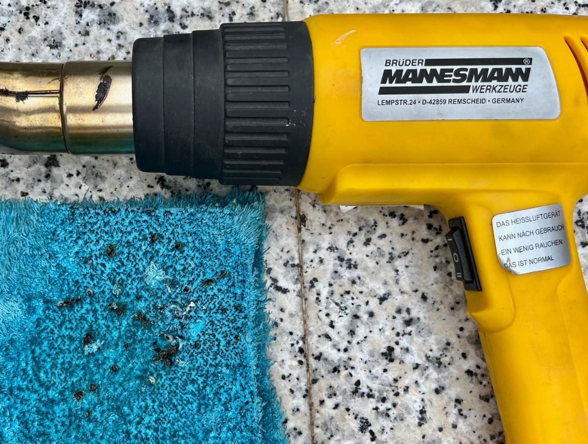 Danke für die Versuche, aber mit dem Heissluftföhn, dem Auspuff, oder sonstigen Möglichkeiten in diesem Temperaturbereich kam das Tuch bei mir nie in Kontakt. Die höchsten Temperaturen waren schwarzer Lack in der Sonne und der Trockner.