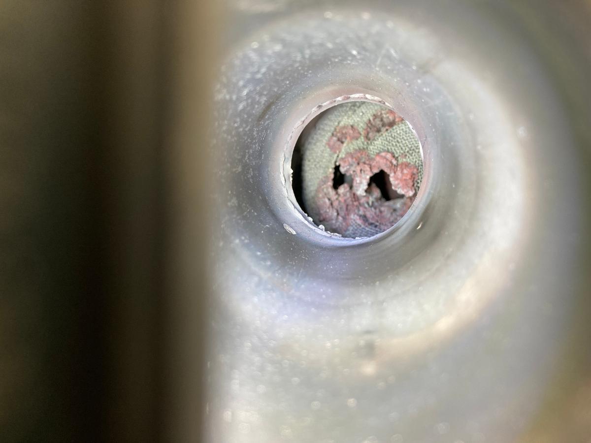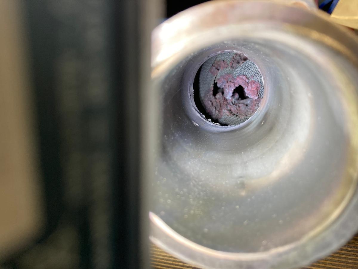 Beim rechten Katalysator zeigt sich leider eine deutliche Beschädigung, offensichtlich ist ausgangsseitig ein Teil des Kats irgendwann mal geschmolzen💩.
