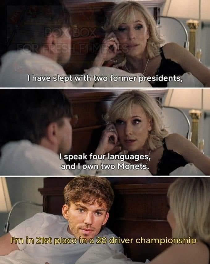 Ich denke bei Lewis Hamilton ist mit Mercedes einfach die Luft raus. Er hat keine große Lust mehr in dem Auto zu fahren. Seine Kritik am Fahrzeug, dessen Entwicklung und am Team werden von Mal zu Mal größer. Schade finde ich da eher, dass das morgige Rennerergebnis erneut absehbar sein wird. Verstappen gewinnt mit großer Wahrscheinlichkeit vor Perez und Sainz. Die Frage ob ich mir das Rennen in aller Frühe anschauen werde und vor lauter Langweile einschlafe oder mir das Rennen nicht anschaue und weiter schlafe hat sich damit erübrigt. Könnte mal bildlich auch so darstellen…