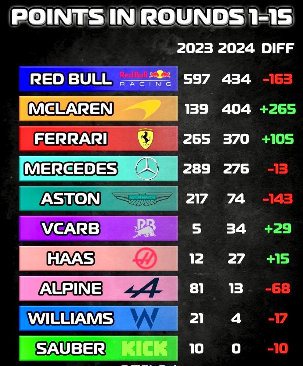 Manche Verbesserungen beziehungsweise Verschlechterung im Jahresvergleich waren mir so gar nicht bewusst. Obwohl ich jedes Rennen schaue. Ich hatte es ehrlicherweise so gar nicht wahrgenommen das Mercedes beispielsweise zurückgefallen ist oder Ferrari einen guten Schritt vorwärts gemacht hat. Mercedes kam mir durch die drei Siege in 2024 bisher deutlich besser vor als in 2023. Und Ferrari kam mir diese Saison weniger gut vor. So kann man sich irren.