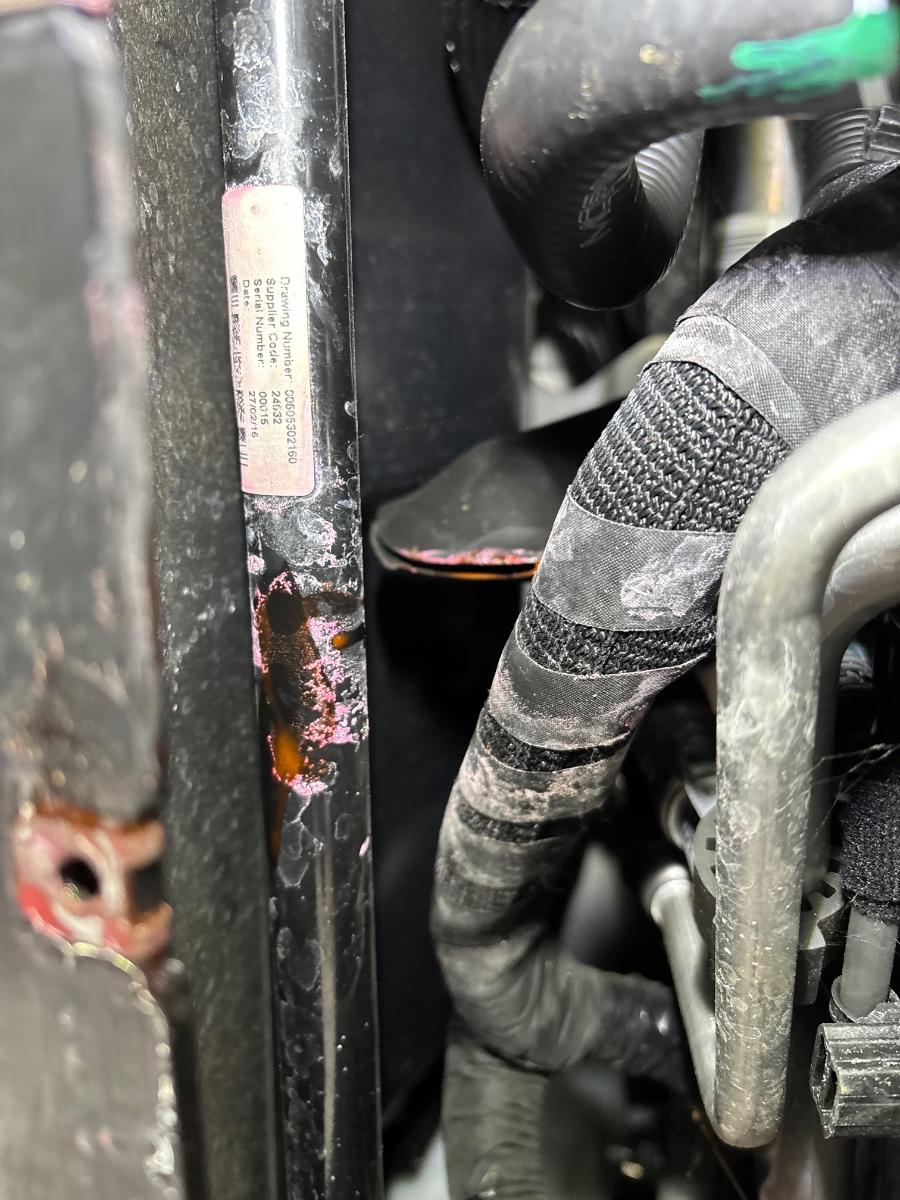 Als der Wagen oben ist, sehe ich, dass unter der Front alles rosa ist - Kühlung defekt.