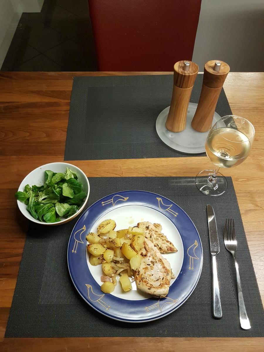 Sodele,  heute Abend gab's Hühnchen in Zitrone/Knoblauch-Marinade mit RosmarinKartoffeln. Dazu Feldsalat, Zitrone/Kürbiskernöl-Dressing und einen trockenen Weissburgunder. Ab morgen ist wieder Frugales angesagt. 🙄