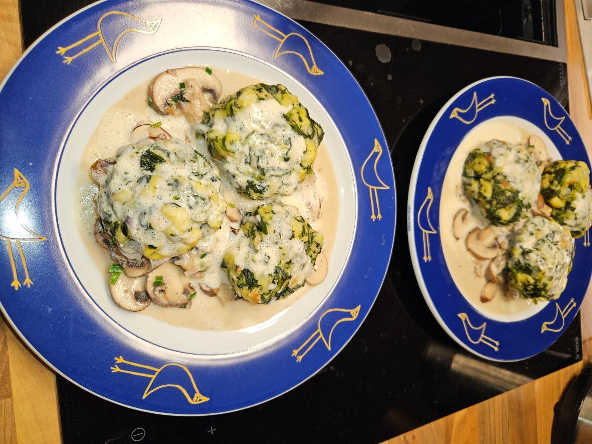 Heute mal wieder den Abend am Herd verbracht und Vegetarisches gezaubert.  Spinatknödel mit Pilzen und Meerrettichschaum...