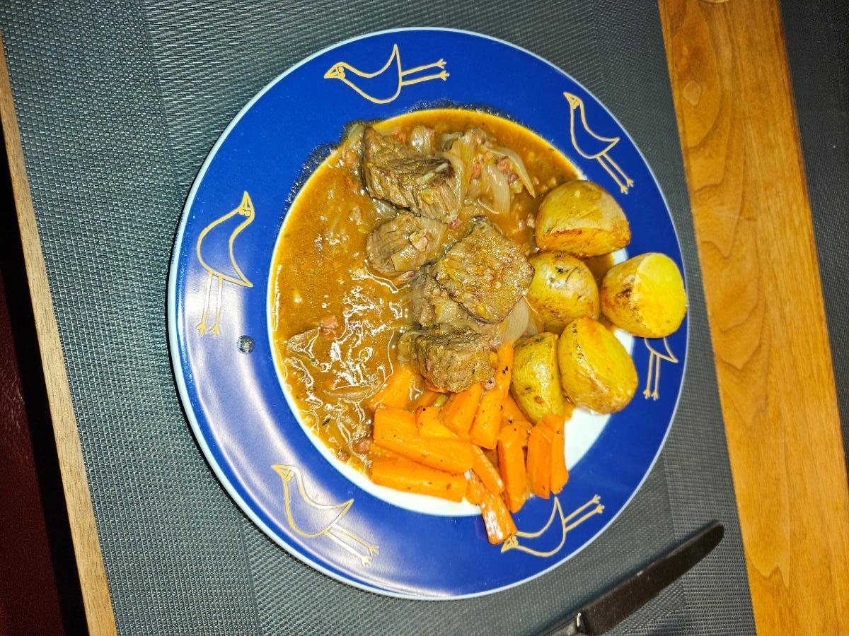 Böff Burginion 😅 Mit Patatas Bravas und glacierten Möhren. Dazu ein Primitivo und Paul Simons "Graceland" 😊