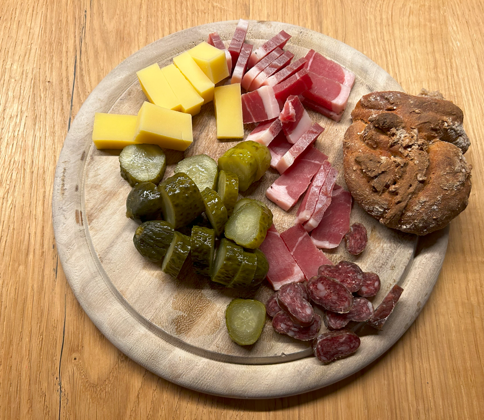 Nicht besonders dekorativ, dafür rustikal und saulecker. Südtiroler Speck, Kaminwurzen, Vorarlberger Bergkäse gestern direkt aus der Sennerei geholt, Essiggurken und ein Vinschgerl - und schon ist der Olli happy 😍