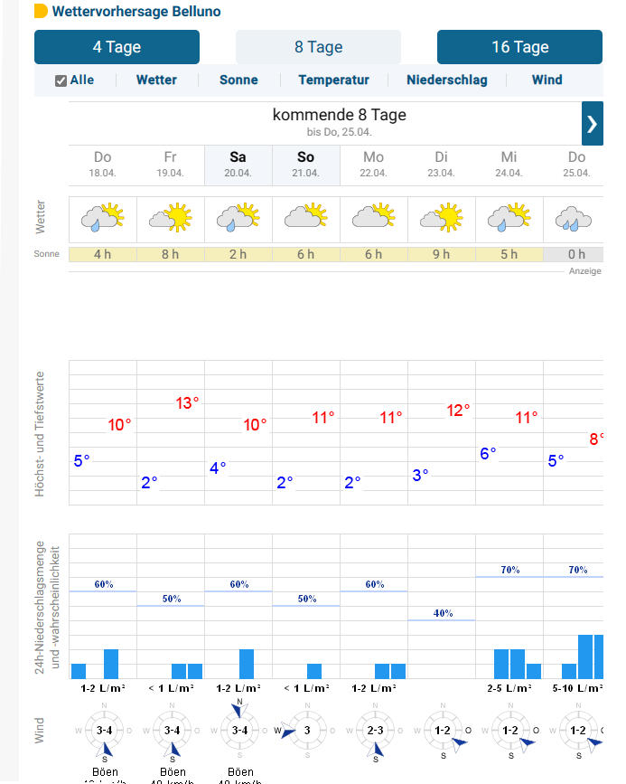 Mittlerweile hab ich für Montag in Cortina 5.3 stunden sonne und 8 Grad (nachts minus 7).