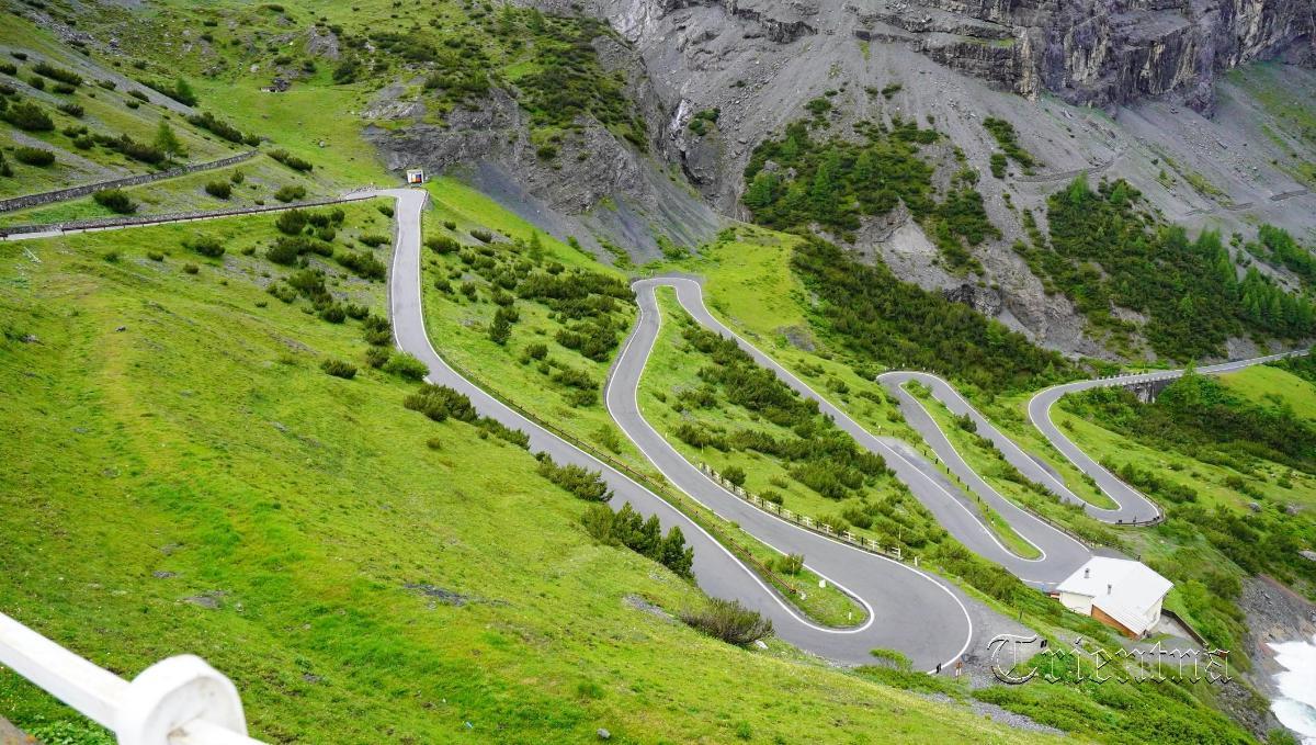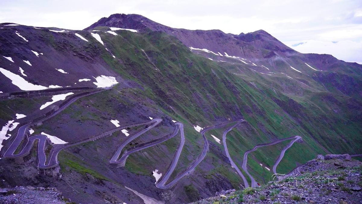 und direktem Blick auf die Serpentinen der Stilfserjoch Straßa