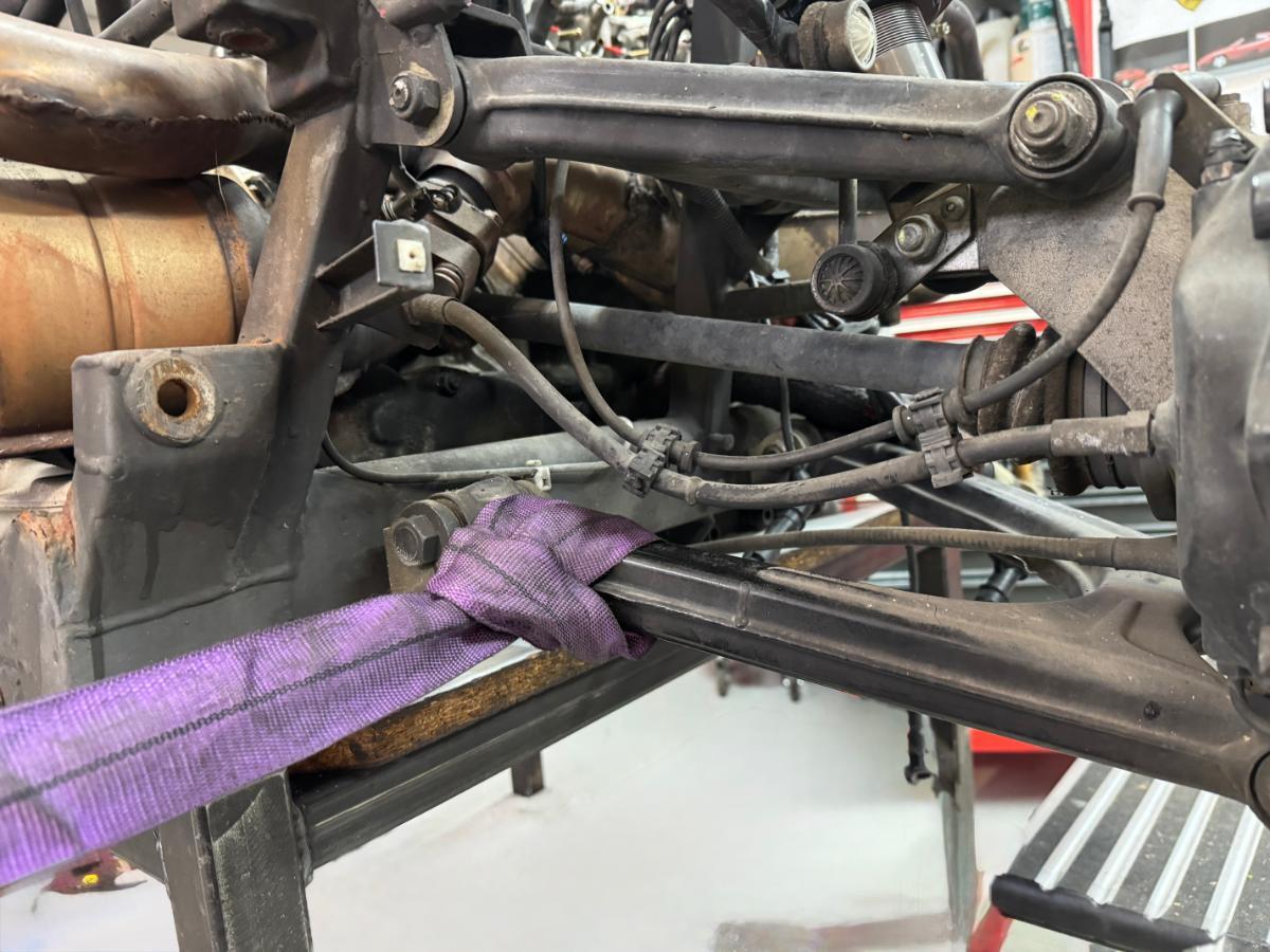 Bevor du die Abgasanlage ausbaust, löse die vier Schrauben vom Stoßfänger, der Halter ist ein Rohr mit T-Stück, eine Schlaufe darum sollte halten. Allerdings ist das tatsächlich, soweit ich das letztes Mal gesehen habe ein hydraulischer/Reibungspuffer, hat jemand Erfahrung ob man den auseinanger zieht?