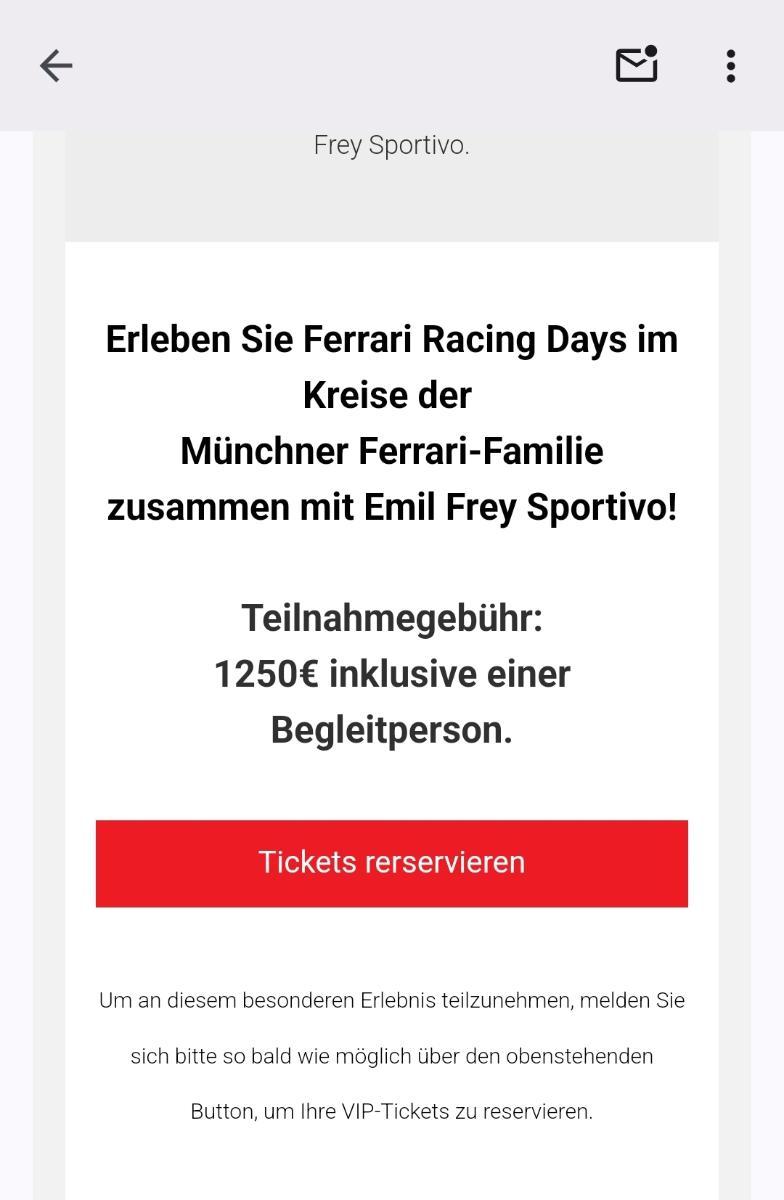 Danke für das Angebot, aber ich habe mit überteuerten, überkandidelt Ferrari Events meinen Frieden gemacht. Meine Zeit verbringe ich lieber mit Familie und Freunden. Und die Sportwagenevents organisiere ich mir einfach selbst!
