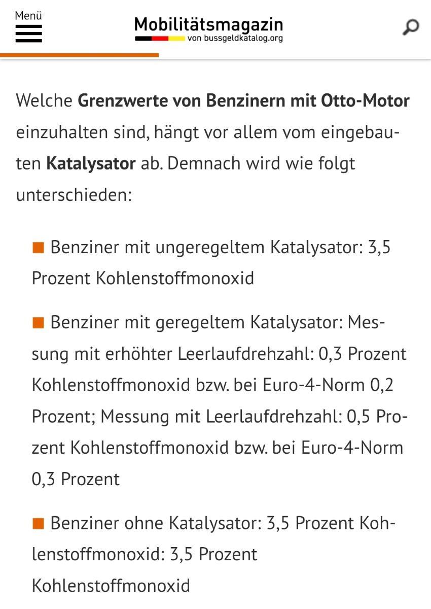 Laut Dekra Prüfer darf der CO-Gehalt bei erhöhter Drehzahl ~2500 Rpm maximal 0,2% betragen, ist aber etwas höher. In den Prüfberichten der letzten 20 Jahre wird immer ein maximaler Wert von 0,3% angegeben, auch in dem von der gleichen Dekra-Prüfstelle vor 2 Jahren. Mit 200er Metallkats war der Wert immer zwischen 0,25 und 0,30%, also knapp drunter. Daraufhin nochmal mit dem Prüfer telefoniert, der sagte mir aber es wäre alles korrekt und der Grenzwert läge jetzt 0,2% CO-Gehalt. Ich glaube auch nicht, dass es an "gutem Willen" fehlt, im Gegenteil.