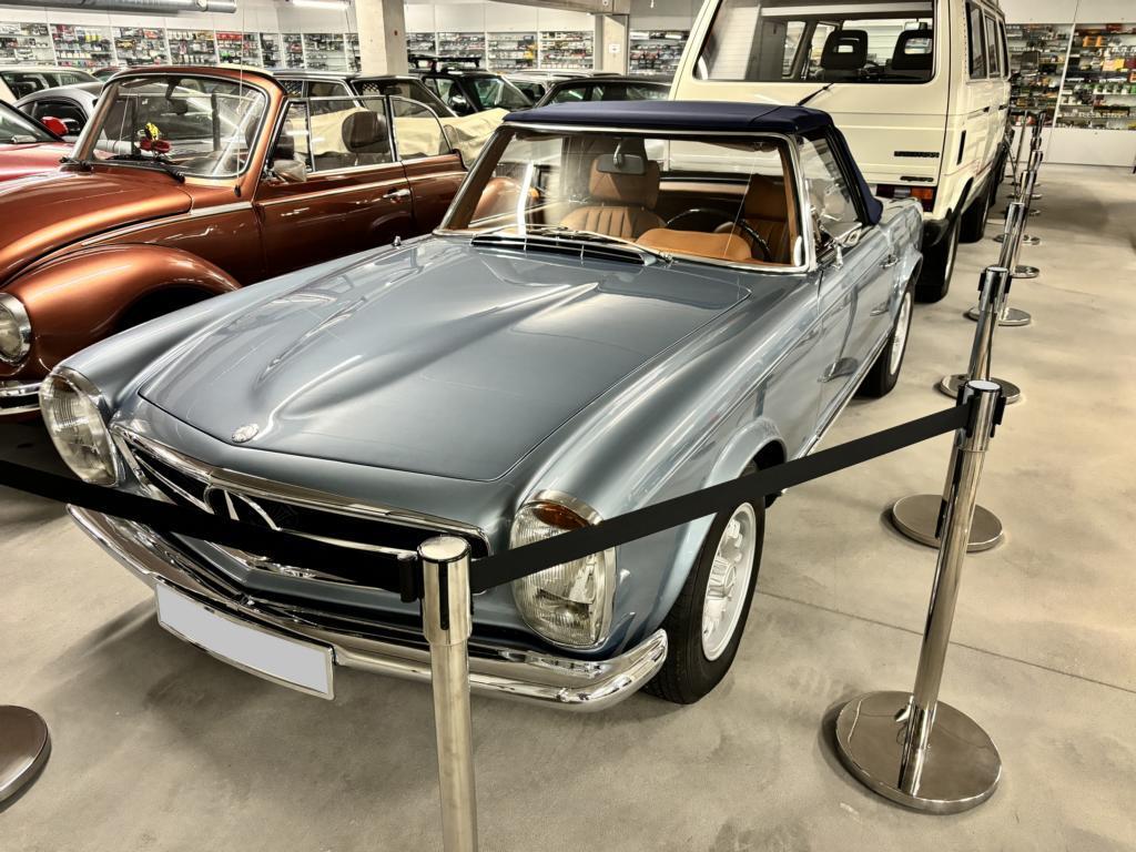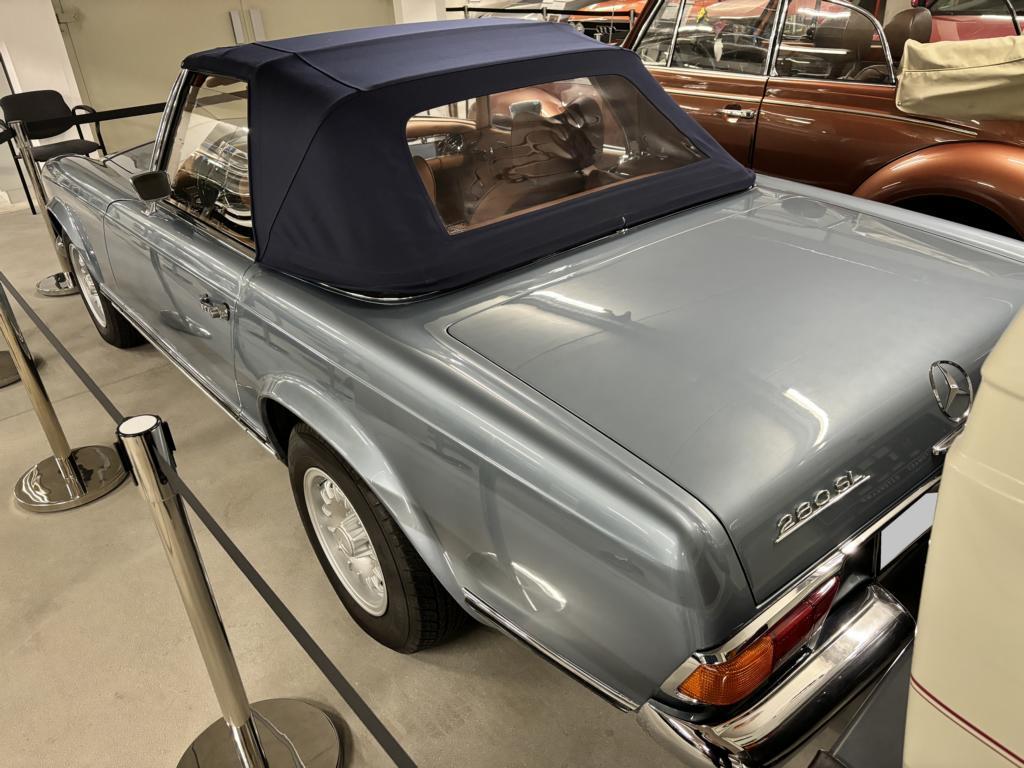 Das ist nach meinem Eindruck bei vielen restaurierten Autos so. Diese wunderschöne Pagade erschien mir auch überrestauriert. Vom Innenraum konnte ich kein Foto machen, weil die Scheiben so spiegelten, aber auf den Fotos kann man erahnen, dass das Leder nicht dem alten entspricht. Es sah glatt und charakterlos aus. Technisch vermutlich besser als neu, tatsächlich meiner Meinung nach schlechter.