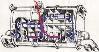 Hier sieht man den Fluß (rot) vom Bypass bei der original Abgasanlage. Der geht ohne Umwege direkt durch den Mittelschacht, wohingegen der blaue Fluß (bei geschlossener Klappe) mehrfach umgelenkt wird.