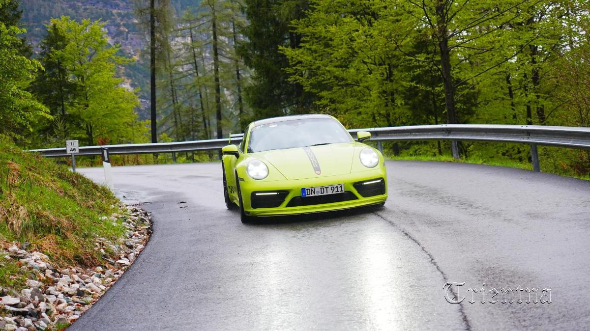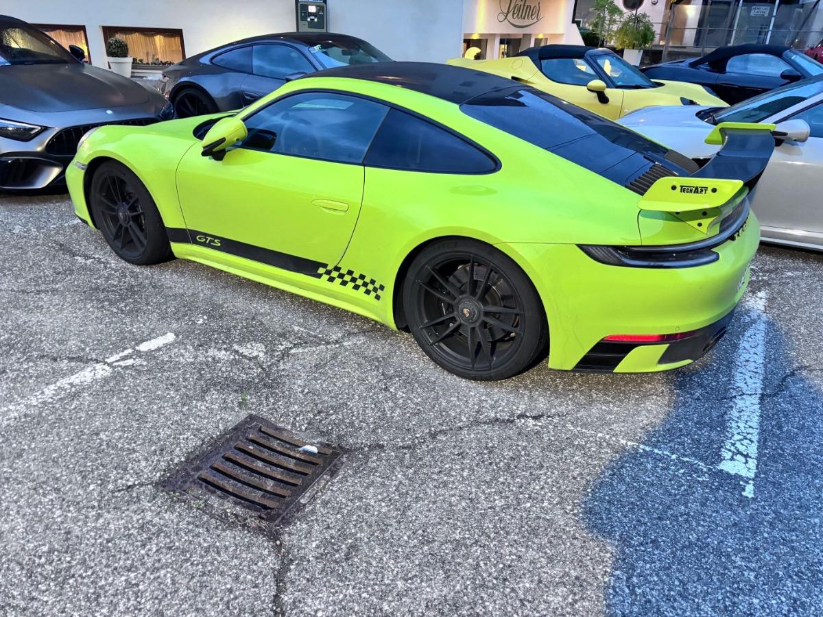 Ich habe den Besitzer zur Sache verhört. Es handelt sich um einen 992 GTS mit serienmäßig 480 PS, der mit TECHART Aerokit versehen ist und zudem durch TECHART-Software leistungsgesteigert ist. Techart habe ihm 80 Mehr-PS versprochen. Er wisse nicht, ob das zutreffe, aber der Elfer gehe „wie die Sau.“
