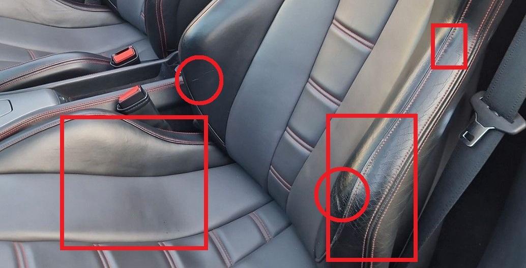 Die Sitze bei dem gezeigten 458er finde ich wirklich schlecht. Ich bin mir nicht ganz sicher, aber aus der Ferne wirkt der Fahrersitz auf mich an mehreren Stellen im Leder ausgebessert. Wahrscheinlich wurde hier angeschliffen und dann mittels Airbrush recht amateurhaft lackiert. Die Sitze würde ich persönlich so nicht fahren wollen und hier eine professionelle Ausbesserung durch einen Lederprofi einpreisen.