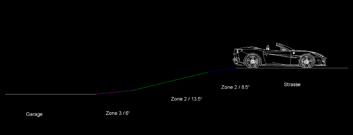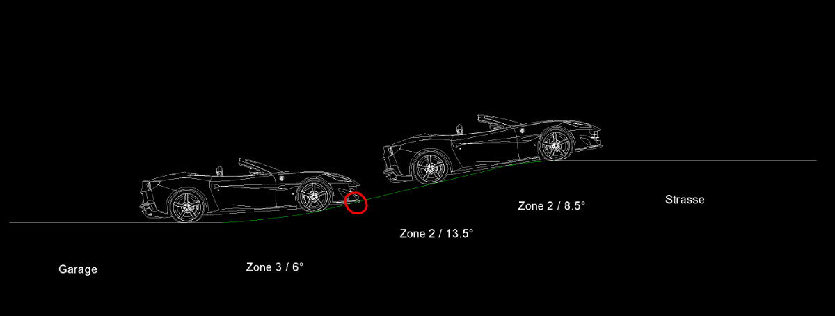 Alternativ kann man die Rampe zur Auffahrt hin jedes Mal "anlegen" und wieder in der Garage verstauen, wenn der Portofino nicht genutzt wird. Dann geht das Garagentor auch zu, führt aber zu zusätzlicher Arbeit bei jeder Ausfahrt.