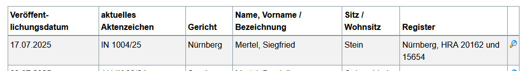 IN 1004/25 | In dem Verfahren über den Antrag d. Mertel Siegfried, geboren am 10.10.1970, Asbacher Weg 9A, 90547 Stein Inhaber der MERTEL Motorsport e.K., Nürnberg, Registergericht: Amtsgericht Nürnberg Registergericht Register-Nr.: HRA 20162 und der F.A.N. Fahrzeugaufbereitung Nürnberg e.K., Nürnberg, Registergericht: Amtsgericht Nürnberg Registergericht Register-Nr.: HRA 15654 - Schuldner - auf Eröffnung des Insolvenzverfahrens über das eigene Vermögen |