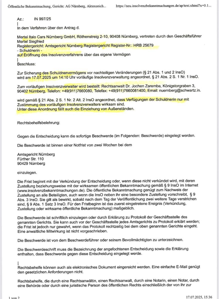 Aber ich finde unter den Insolvenzbekanntmachungen noch nichts zum Thema Italo Cars. Also ist das Insolvenzverfahren noch nicht einmal eröffnet wie es scheint. Weiß hier jemand mehr dazu warum es sich so zieht? Die Prüfung selbst kann ja nicht solange dauern, und zumindest ein vorläufiger Insolvenzverwalter wäre zumindest schon mal hilfreich.