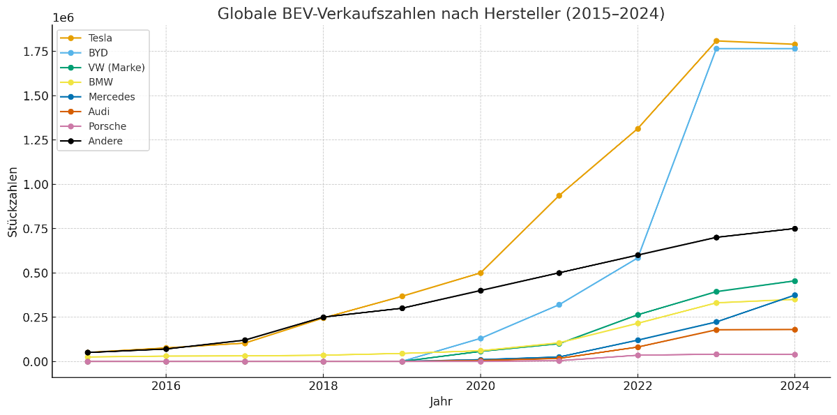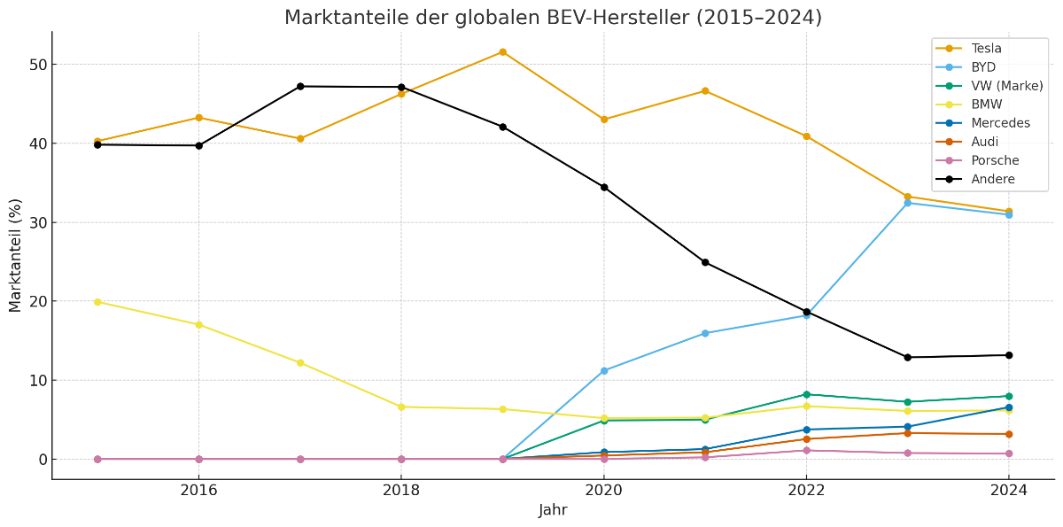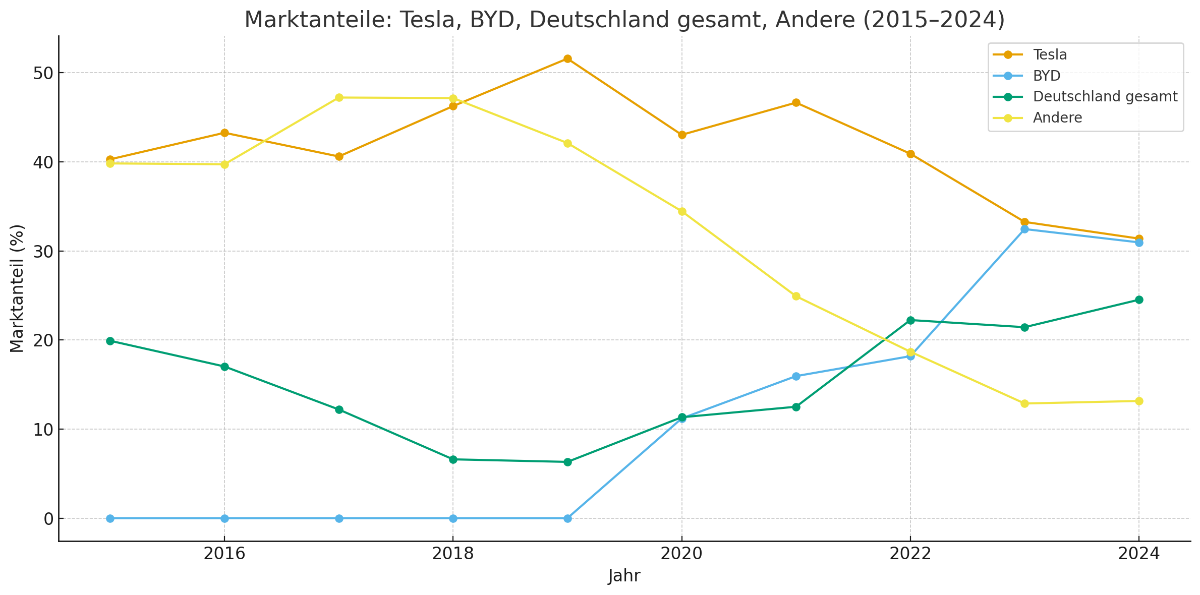 Kumulierten Marktanteil aller deutschen Hersteller (VW, BMW, Mercedes, Audi, Porsche) im Vergleich zu Tesla, BYD und allen übrigen Herstellern: