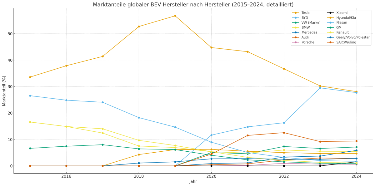 Entwicklung der prozentualen Marktanteile der wichtigsten Elektroautohersteller von 2015 bis 2024: