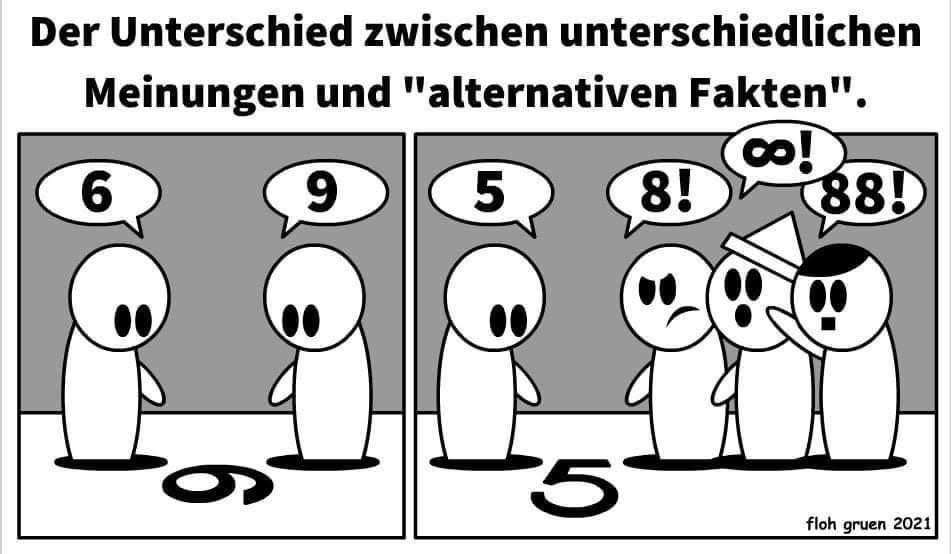 Ich sehe auch die Darstellung von Andreas als nicht richtig an. Fakten sind per se belegbare Dinge, Meinungen müssen nicht der Wahrheit entsprechen, streng genommen ist also das erste Bild alternative Fakren und das Zweite Meinungen, aber da werden wenige Leute meiner Meinung sein.