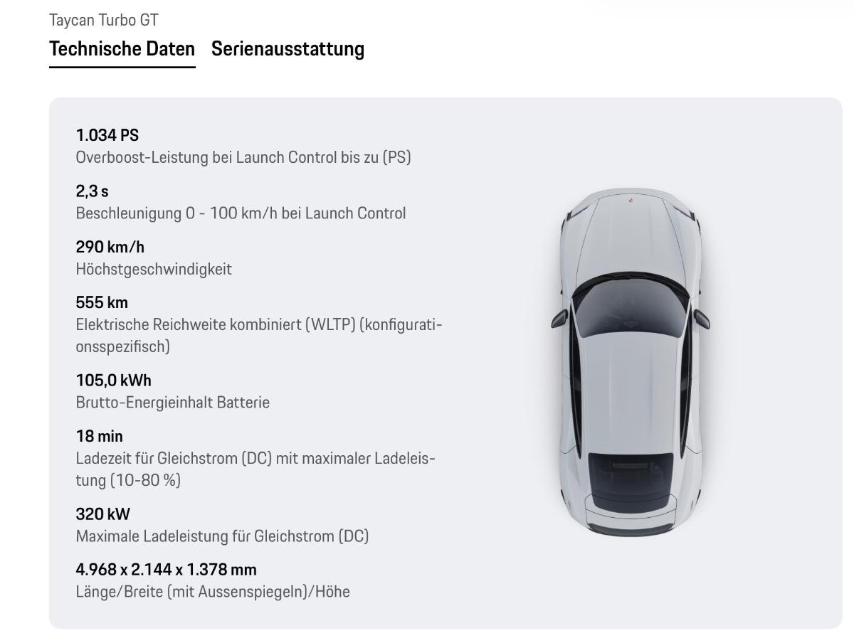 Die 1.000PS Spitzenleistung dagegen enttäuschen, wenn man schon doppelten Kurs eines Taycan Turbo GT aufrufen will, müsste da eine höhere Zahl stehen, Topspeed alleine reicht da nicht.
