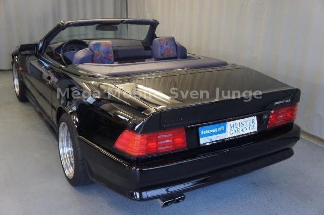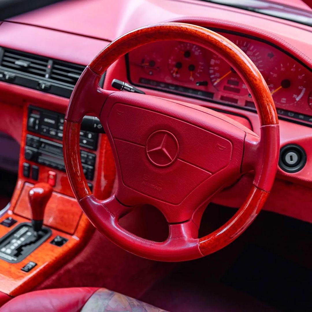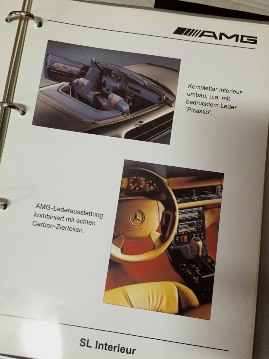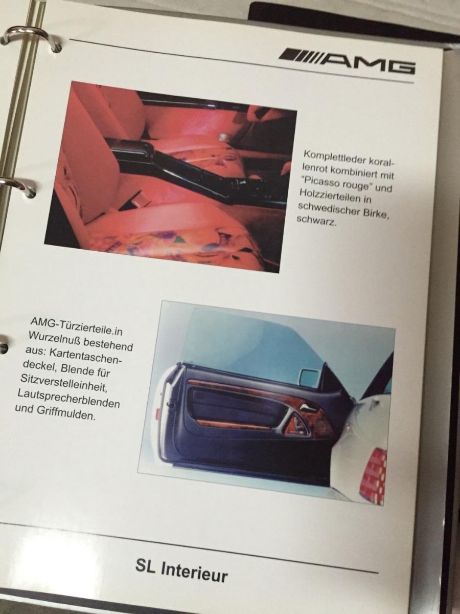 Der folgende 500SL könnte das Fahrzeug aus dem oben abgebildeten AMG Prospekt sein. Das dürfte ebenfalls Kobaltblau sein, auch wenn das Leder auf den Bildern dunkler wirkt.