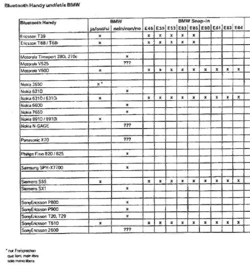Wie versprochen sende ich euch die Tabelle. Ihr seht daraus welche Handy's bei BMW mit Bluetooth funzen (Spalte ja/nein) und ihr seht daraus