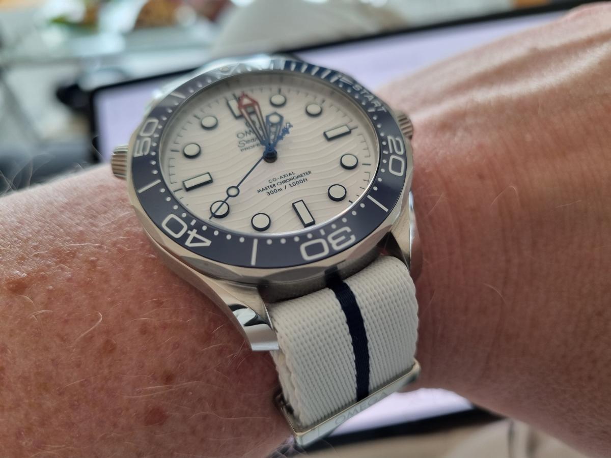 Heute die OMEGA Seamaster Professional America's Cup Edition, mit dem passenden NATO Band. Ihr markantes Design, inspiriert vom prestigeträchtigen Segelrennen, trifft auf höchste Präzision mit dem Co-Axial Master Chronometer Werk.