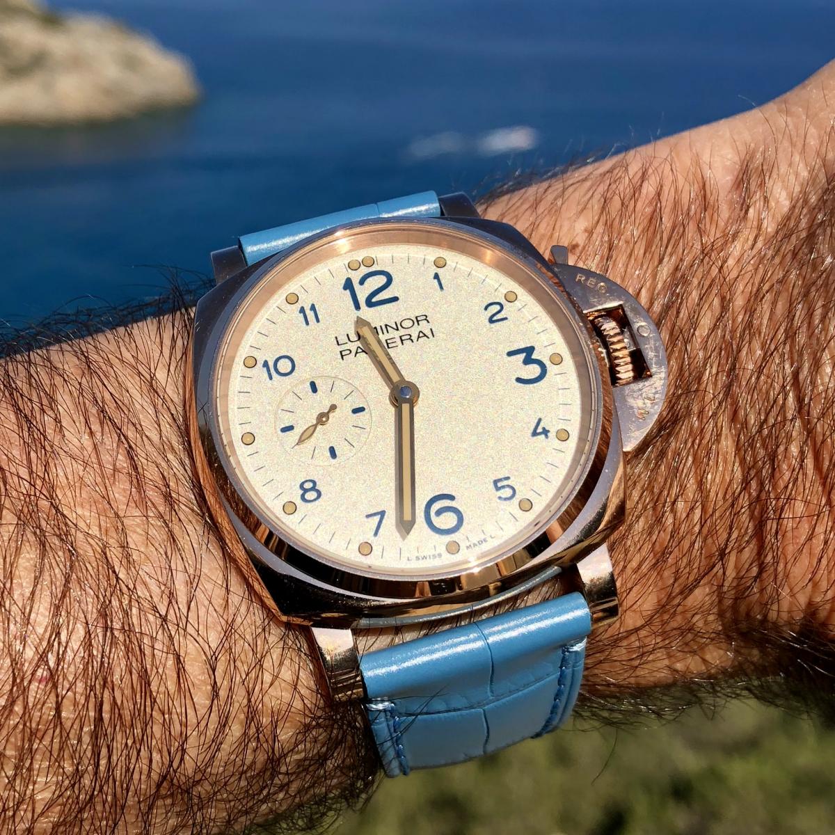 Der Stil erinnert mich an die wunderschönen Beach-Daytonas von Rolex. Steht der PAM hervorragend. Ist das Rotgold?