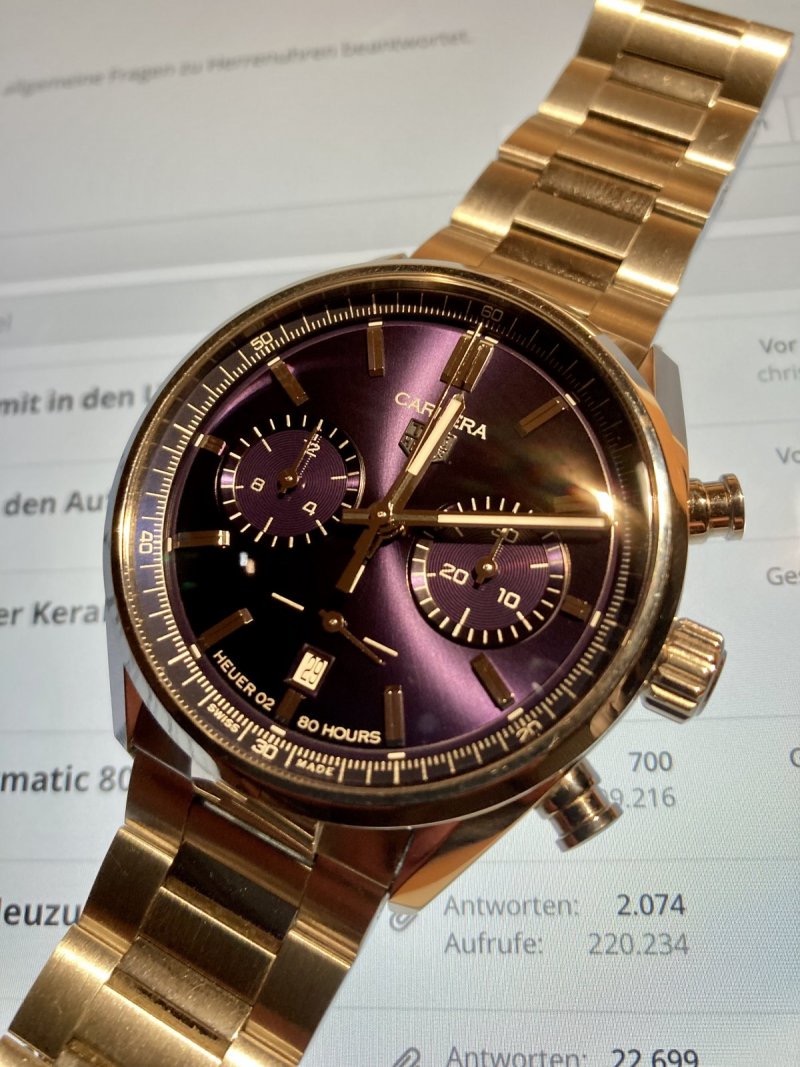 Was mich fasziniert hier, ist der Wechsel des Farbeindruckes je nach Lichteinfall vom Zifferblatt....
