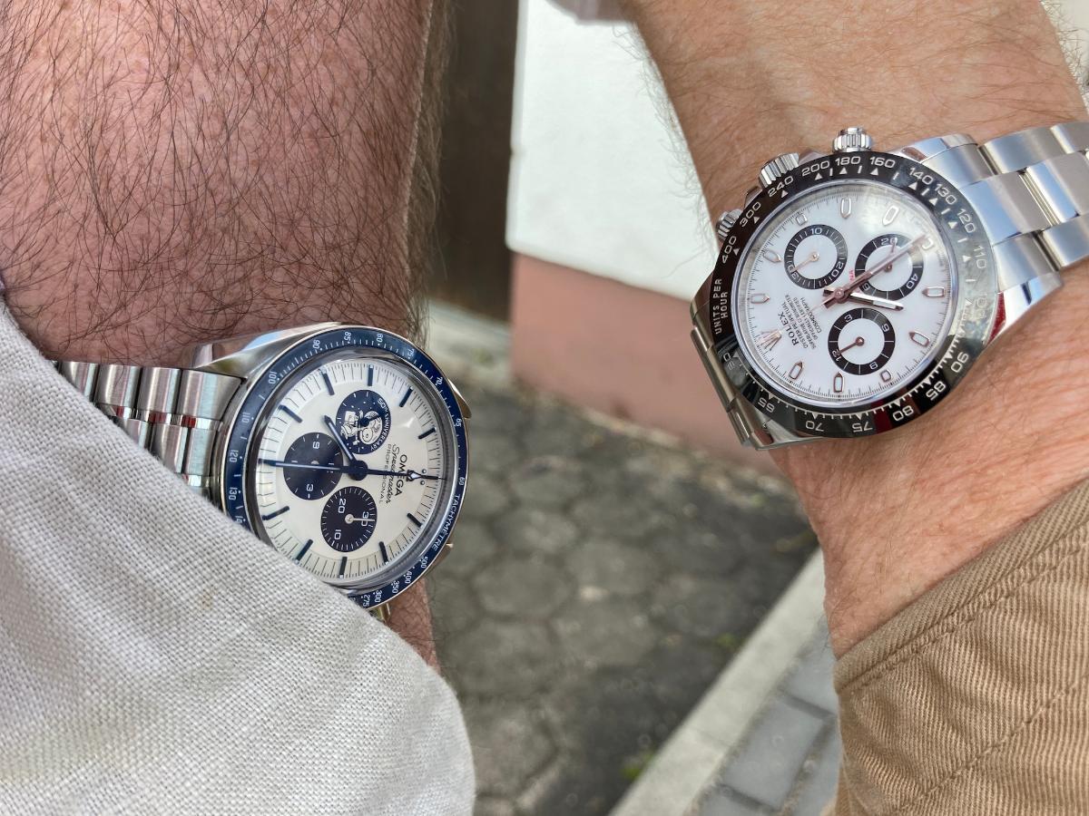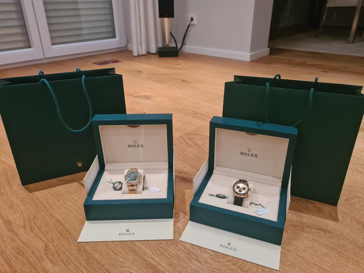 Mein Juwelier hat es vor 8 Wochen auch gut gemeint mit mir und ich durfte diese zwei Derivate abholen. Auf den letzten Drücker, denn die goldene Daytona mit dem grünen Zifferblatt wurde gerade eingestellt. Hat mich aber auch viel Einsatz gekostet, da wohl der halbe Globus diese Uhr will 🙈