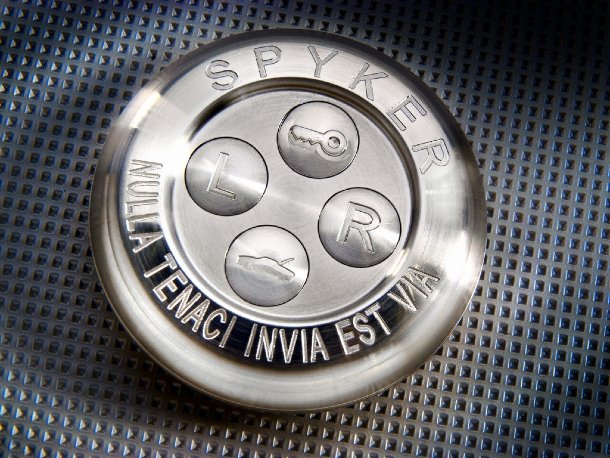 Wie öffnet und startet man eigentlich einen Spyker? Wer sich das Einleitungsbild dieses Artikels näher angesehen hat, wird eventuell bereits entdeckt haben, dass es sich bei dem kreisrunden Metallteil nicht einfach um einen Schlüsselanhänger handelt – es IST der Spyker-Schlüssel. Mittels Knopfdruck kann man die linke und rechte Tür, sowie den Kofferraumdeckel ent- oder verriegeln. Der Türöffner verbirgt sich auf der Rückseite der Außenspiegel und lässt die Türen nach oben schwenken. Wenn man das komplette Fahrzeug öffnet, also auch die vordere und hintere Haube aufmacht, entfaltet sich der Spyker beinahe wie ein Blumenkelch in der Sonne. Zum Starten des Motors muss eine rote Abdeckung über dem Zündungsschalter hochgeklappt werden. Diese Prozedur erinnert an die Sicherung des Raketen-Abfeuer-Knopfes in Kampfjets. Ist die Zündung aktiviert, kann der Motor per Knopfdruck gestartet werden und meldet sich grummelnd zu Wort.