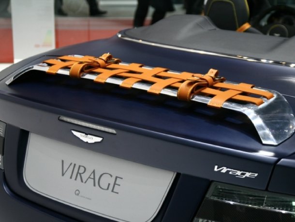 Der Aston Martin-Stand auf dem Genfer Salon stand dieses Jahr zum einen im Zeichen des Einstiegs-Sportwagens Vantage, der in Form des V8 Vantage eine Modellpflege erfuhr und gleichzeitig um den auf 150 Einheiten limitierten V12 Zagato ergänzt wurde, zum anderen zeigte man die ersten Arbeiten der neuen Individualisierungsabteilung „Q by Aston Martin“. Dabei handelte es sich um einen Cygnet in edlem Himbeer metallic mit dreifarbiger Innenausstattung und neuartiger Foto-Lederveredelung und um einen Virage Roadster in dunklem Mattblau, der auf dem Kofferraumdeckel über einen Gepäckträger mit Ledergurten verfügte. Der Innenraum präsentierte sich passend in dunklem Blau mit gelben Akzenten und blau eingefärbtem Sichtcarbon an der Mittelkonsole.