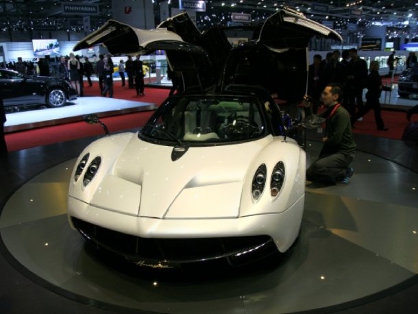 Neben dem Sichtcarbon-Huayra stand ein Schwesterfahrzeug in Weiß.