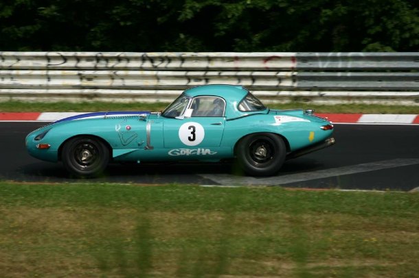 Nun hieß es „Hühner satteln“ und ab an die Nordschleife. Während auf dem GP-Kurs des Nürburgrings am Freitag Morgen und Mittag die unterschiedlichen Rennserien trainieren findet auf der historischen, 20,83 km langen Strecke erst ein 100 km Rennen für Youngtimer und anschließend, nach dem Zusammenschluß von GP-Kurs und Nordschleife, ein Marathon-Rennen für Oldtimer statt. Mich zog es zum Adenauer Forst, wo ich mich zuerst in der ersten Rechtskurve austobte, um für das Marathon-Rennen dann in die Linkskurve zu wechseln, wo ich auf zwei sehr nette Streckenposten traf. Liebe Grüße an dieser Stelle an Posten 99. Das Youngtimer-Rennen gewannen Chris Stahl und Klaus Ludwig auf einem wunderschönen Porsche 934 mit der Startnummer 501. Im Marathon-Rennen behielt wieder einmal Marcus Graf von Oeynhausen die Schnauze seines mintgrünen Jaguar E Type vorn. Hut ab aber auch vor Leuten, die mit einem Einzelstück wie dem Aston Martin DP214 an Rennen auf der grünen Hölle teilnehmen.