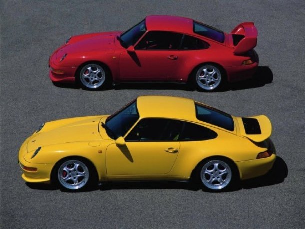 Auch der Porsche 993 Carrera RS belebte den Mythos RS wieder. Es gab ihn auf Wunsch auch als Clubsport-Variante mit größeren Flügeln rundum (hinten im Bild).