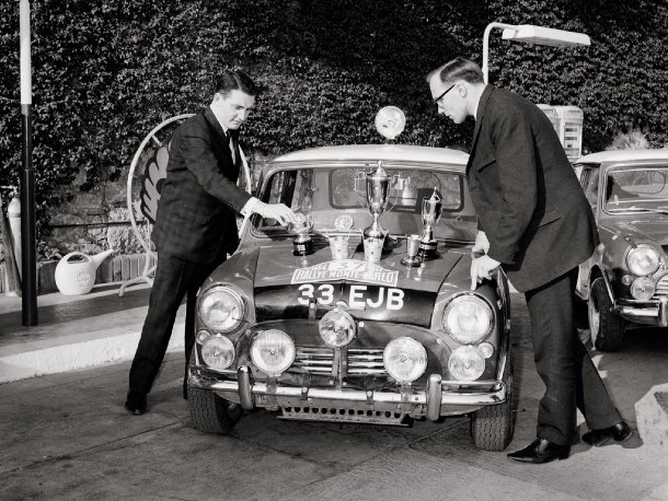 So aufgerüstet machte sich eine kleine Mannschaft rund um den Rallyefahrer Rauno Aaltonen auf zur Rallye Monte Carlo 1964. Wer schon einmal einen Mini neben einem Austin Healey 3000 oder einem Saab 92 hat stehen sehen, kann sich grob ausmalen, wie laut das Gelächter der Konkurrenten vor Ort war. Was wollte diese kleine englische Mannschaft mit diesem Winzling denn bitte bei der Mutter aller Rallyes ausrichten können? Noch dazu mit Frontantrieb, geht’s denn noch peinlicher? Ja, geht. Wenn man nämlich auf das Endergebnis schaut, stand plötzlich der Name „Mini“ meilenweit oben an, danach lange nichts und dann die kleinlaute Gegnerschaft. Vernichtend geschlagen im ersten Anlauf. Auch 1965 und 1967 stand ein Mini-Fahrer ganz oben auf dem Podest in der Fürstenloge in Monte Carlo. 1966 hätte man eigentlich auch gewonnen, allerdings gab es einen nicht ganz nachvollziehbaren Protest gegen angeblich nicht homologierte Zusatzscheinwerfer, weswegen das BMC-Team komplett aus der Wertung genommen wurde. Auch damals gab es bereits Kleinkriege zwischen einzelnen Automobilverbänden und -herstellern. Neben den Rallye-Erfolgen machte sich der Mini inzwischen auch auf der Rundstrecke einen hervorragenden Namen, wo er gegen viel stärkere Gegner häufig Siege herausfahren konnte. Übrigens errang Niki Lauda in einem Mini seine ersten Pokale.
