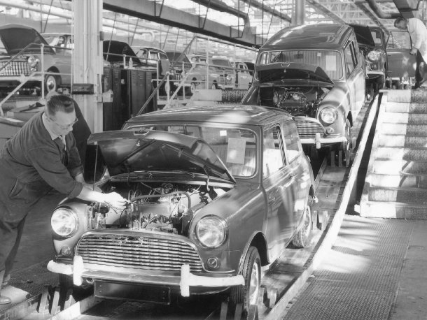 Vor nunmehr bereits 50 Jahren stand der Austin 7 vor der Ablösung durch ein neues Modell. Damals war es noch nicht so üblich wie heute, dass bereits Monate oder gar Jahre im vorraus in Zeitungen über jeden gesichteten Prototypen und jedes aufgeschnappte Gerücht bezüglich neuer Modelle berichtet wurde. Daher war die weltweite Überraschung umso größer, als Alec Issigonis im August 1959 das Tuch von der Karosserie des neuen Austin Seven zog. Zeitgleich ging das Fahrzeug auch als Morris Mini Minor an den Start, da beide Firmen zu BMC (British Motor Corporation) gehörten. Unterscheiden ließen sich die beiden nur durch den Kühlergrill, die Radkappen auf den 10-Zoll-Rädern und andere Karosseriefarben. Auf diese Weise wurde das heute so beliebte „Badge-Engineering“ erfunden: eine Firma entwickelt ein Fahrzeug und mehrere andere verkaufen es anschließend ebenfalls, nur mit ihrem Logo und ein paar kleinen Änderungen. Dies sollte den Mini über die Jahre hinweg ständig begleiten. Es gibt wohl kaum ein Auto, das zeitgleich unter mehr Marken gefertigt wurde.