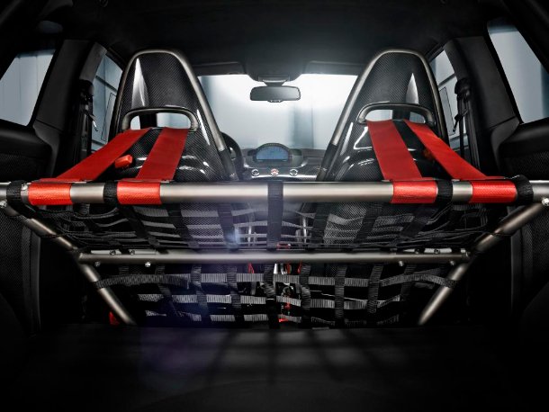 Dort, wo sonst eine Rückbank zu finden ist, gibt es im Abarth 695 Biposto eine Querstrebe des Titan-Überrollbügels, an der die Vierpunktgurte hängen.