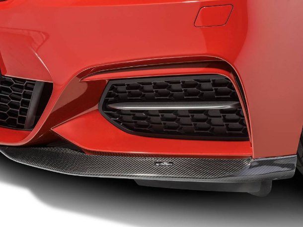Ein zweiteiliger Frontflipper in Sichtcarbon verbessert den Abtrieb an der Vorderachse deutlich.