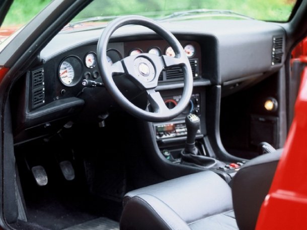 Der Innenraum des Zweisitzers ist sportlich spartanisch ausgelegt. Zwar findet sich an vielen Stellen edles Leder, dennoch sieht man der reichlich eckigen Gestaltung an, dass sie aus den späten 1980er Jahren stammt. Insgesamt sieben Rundinstrumente informieren den Fahrer jederzeit über alle wichtigen Dinge, die im Motorraum vor sich gehen, während er sich in die Sportsitze kuschelt und über ein sportlich abgestuftes Fünfgang-Getriebe den V6 bei Laune hält. Das Dreispeichen-Sportlenkrad wurde von Momo zugeliefert.