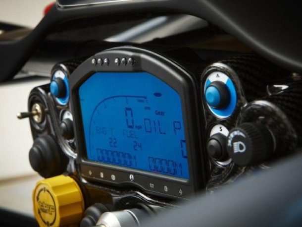 Im spartanischen Interieur hat sich wenig verändert. Was sollte man auch ernsthaft hinzufügen wollen? Elektrische Fensterheber machen ebenso wenig Sinn, wie eine Klimaanlage. Hinter dem airbaglosen Sportlenkrad ist ein Multifunktions-LCD-Display, auf dem Geschwindigkeit, Drehzahl und weitere Funktionen wie die Anzeige des optimalen Gangs angezeigt werden, angebracht. Am oberen Ende sind Schaltleuchten in die Umrandung integriert, um rechtzeitig zum hochschalten zu ermahnen. An das Display kann auf Wunsch ein Datenaufzeichnungsgerät angeschlossen werden, mit dem Rundenzeiten und Beschleunigungskräfte mitgeschnitten werden können.