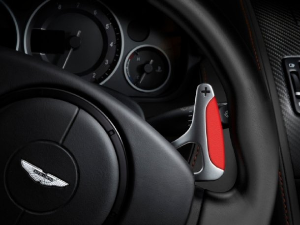 Das Interieur zeigt sich in sportivem Schwarz mit je nach Wahl roten oder silbernen Ziernähten. Auf den Sitzflächen, den Türtafeln und am Dachhimmel ist das Leder in Rautensteppung ausgeführt. In die Kopfstützen ist das DBS-Logo inklusive rotem „S“ eingestickt. Der Kunde kann zwischen dem manuellen Sechsgang-Getriebe und der automatisierten Touchtronic II mit ebenfalls sechs Gängen und Schaltwippen am Lenkrad wählen. Diese Schaltwippen werden beim DBS Ultimate mit rotem Leder veredelt, um die sinnliche Erfahrung dieses Fahrzeugs bis in die Fingerspitzen fortzusetzen. Die Mittelkonsole trägt eine Dekorblende in Sichtcarbon, auf dem Mitteltunnel geht es in schwarzem Klavierlack weiter.