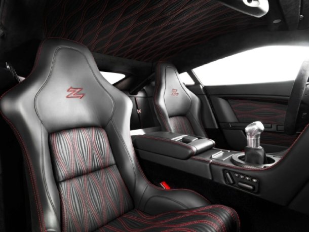 Auch das Interieur präsentiert sich sportlich-luxuriös. In das Leder wird per Hand auf Sitzfläche und im unteren Bereich der Lehne ein Wellenmuster in Kontrastfarbe eingestickt, das sich auch im Dachhimmel wiederfindet. Im oberen Bereich der Lehne ist das Zagato „Z“ eingestickt. Das Armaturenbrett trägt Dekorleisten in mattem Sichtcarbon, während auf der Mittelkonsole schwarzer Pianolack den Aluminiumschalthebel in Szene setzt. Beim öffnen der Türen fällt der Blick direkt auf die Carbon-Einstiegsleisten, in die aus Metall der „V12 Zagato“-Schriftzug eingelegt ist.