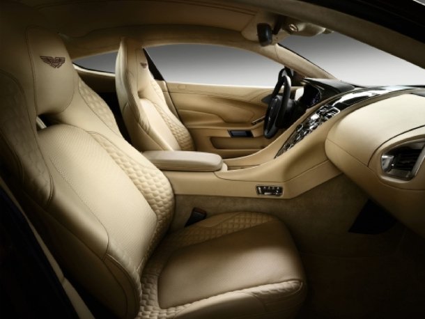 Das Cockpit des Aston Martin Vanquish gibt sich gewohnt luxuriös. Leder mit Rautensteppung in einigen Bereichen und in die Kopfstützen eingestickte Markenlogos gehören ab Werk dazu.