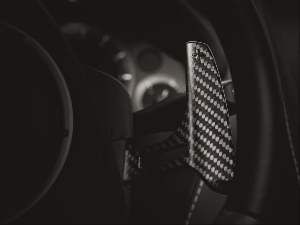 Die Schaltwippen am Lenkrad können in Sichtcarbon, Leder oder der Farbe der Kontrastnähte bestellt werden.